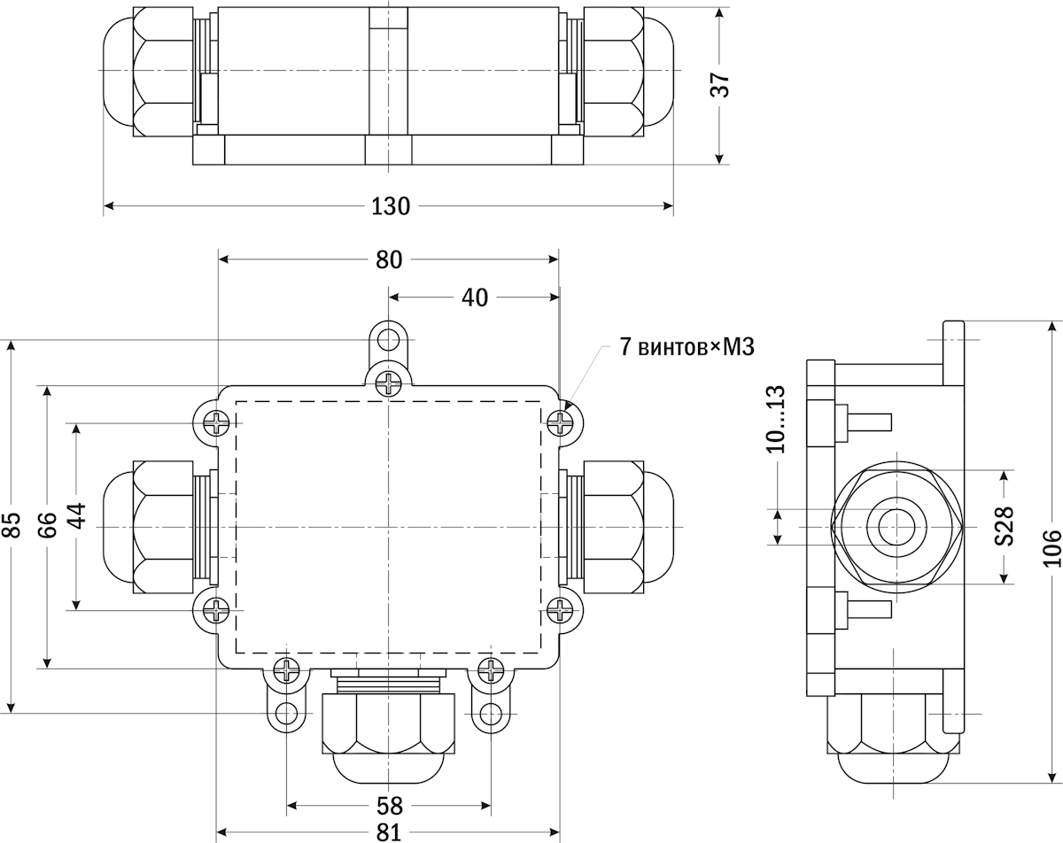 На задней панели коробки расположены 3 отверстия для установки на стену (плоскость). Размеры монтажных отверстий представлены на чертеже.