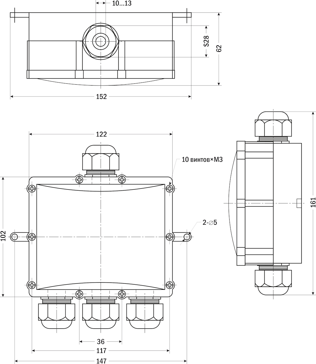 На задней панели коробки расположены два отверстия для установки на стену (плоскость). Размеры монтажных отверстий представлены на чертеже.