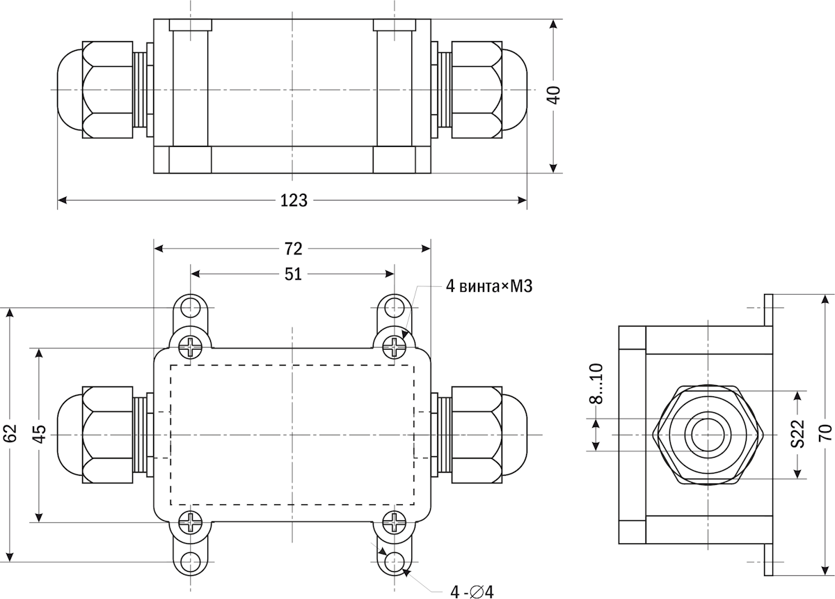 На задней панели коробки расположены 4 отверстия для установки на стену (плоскость). Размеры монтажных отверстий представлены на чертеже.