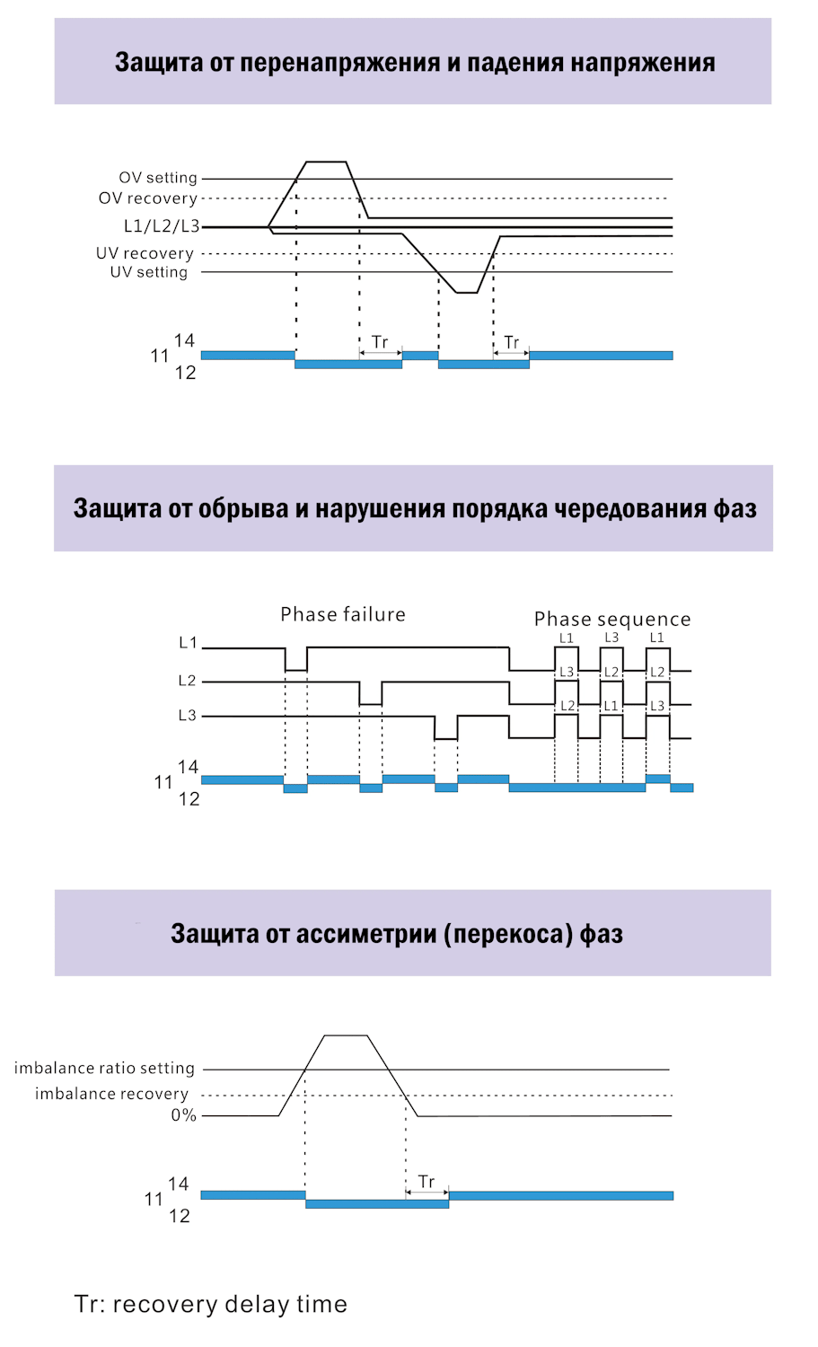 | Регулируемое время отключения нагрузки при асимметрии (перекосе) фаз | 1...25 с